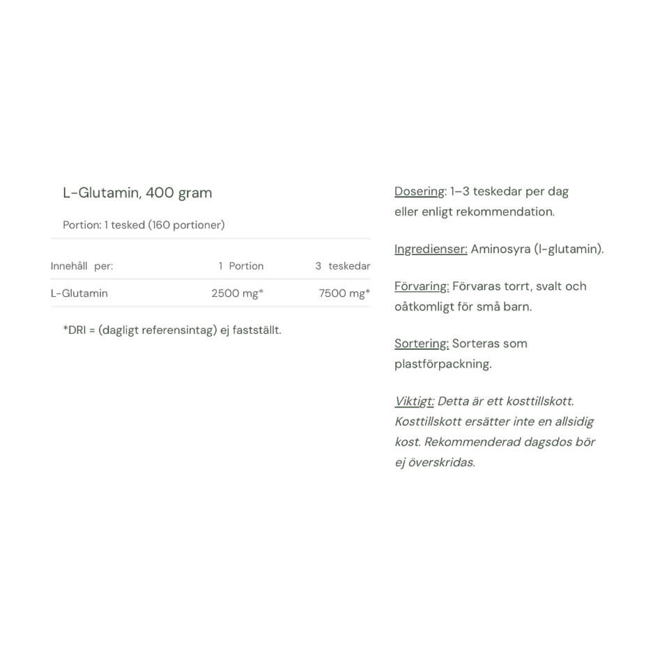 L-glutamin används ofta som kosttillskott av personer som vill komplettera sitt aminosyraintag på ett enkelt sätt. Det förekommer även i rutiner kring träning, eftersom muskelvävnad innehåller mycket glutamin och kroppen använder aminosyror i sina normala funktioner efter fysisk aktivitet. Pulvret är smakneutralt och lätt att blanda i dryck, vilket gör det smidigt att använda både i vardagen och i träningssammanhang.